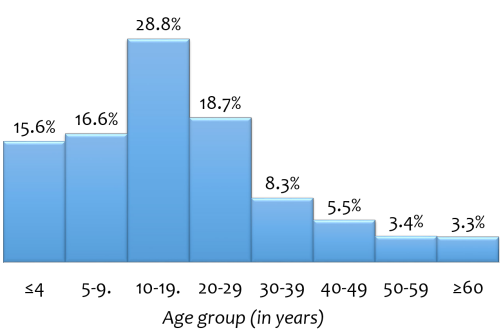 Epilepsy is a neurological condition that can be experienced at any age.2 This study reports a mean age of 19.4 ± 16.1 years (range: 2 months and 88 years) and the age group most represented was 10-19 years. This mean age is comparable to 20.0 ± 15.1 years reported by Mukuku et al.3 in Lubumbashi (in DRC). In a Pakistani study, Jawaid et al.11 found a mean age of 21.4 ±3.2 years. In studies in SSA and other developing countries, the mean age of epileptic patients ranges from 15 to 20 years,12,13 unlike in developed countries where epilepsy has a bimodal distribution (i.e. one peak after a few years of birth and the other peak occurs after 65 years).14