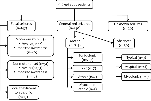 Materials and methods: This was a cross-sectional study of 917 epileptic patients received in neurology consultation at the Neuropsychiatric Hospital Center in Goma (in the DRC) from January 1st, 2017 to December 31st, 2021.