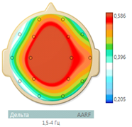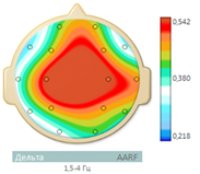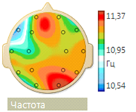 Figure 7 Frequency-spatial structure of the alpha rhythm with a tendency to normalization (the alpha rhythm of the maximum frequency is located mainly in the occipital region, and the minimum frequency - in the frontal region).