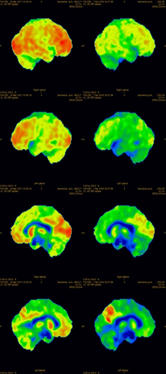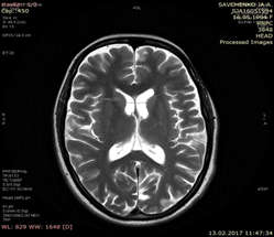 Figure 4 Results of brain examination of patient, 24 years old, by PET/CT method with F18 fluorodeoxyglucose radiopharmaceutical after the first course of administration of autologous mesenchymal bone marrow stem cells.