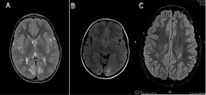 A) Patient #1. MRI in T2, axial slice, bilateral occipital atrophy with white matter involvement.