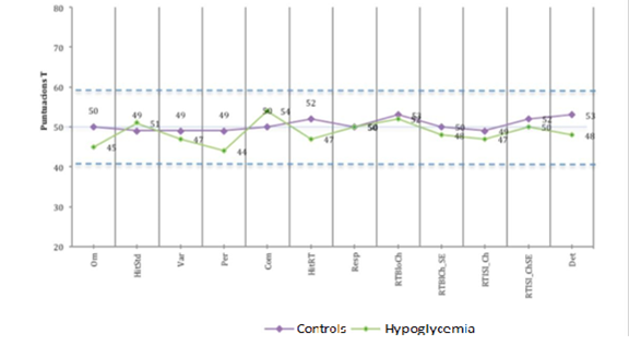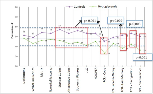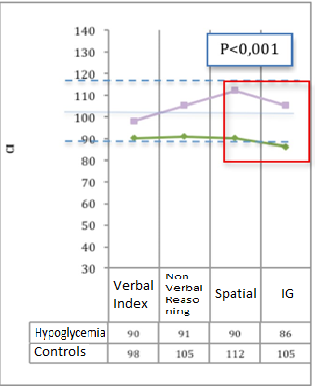 A comparison of the BAS-II School cognitive tests, visual perception, visual memory and CPT-II continuous performance between the case group (history of hypoglycemia) and the control group was carried out; for these group comparisons it was taken into account that in the age percentiles, the two groups presented equal percentage of age intervals and gender ratio. Performances less than or equal to the 13th percentile (a t equal to or less than 39) is considered lower-scoring evidence. Intergroup comparison with P < 0.001 is considered statistically significant.