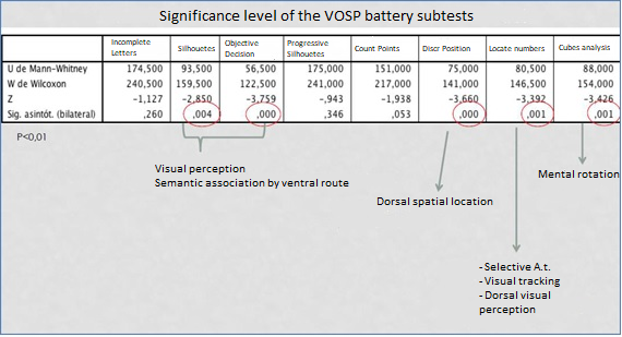 In the different tests performed in the two groups (intergroup comparison) we found several differences, some of which were statistically significant (P<0.001), such as in the BAS-II test: differences in the standard cubes, alternative cubes and figure recall tests; as well as in the JLO test and discrimination and copying in the FCR test. On the other hand, other tests such as immediate and delayed memory and recognition of the FCR test were not statistically significant.