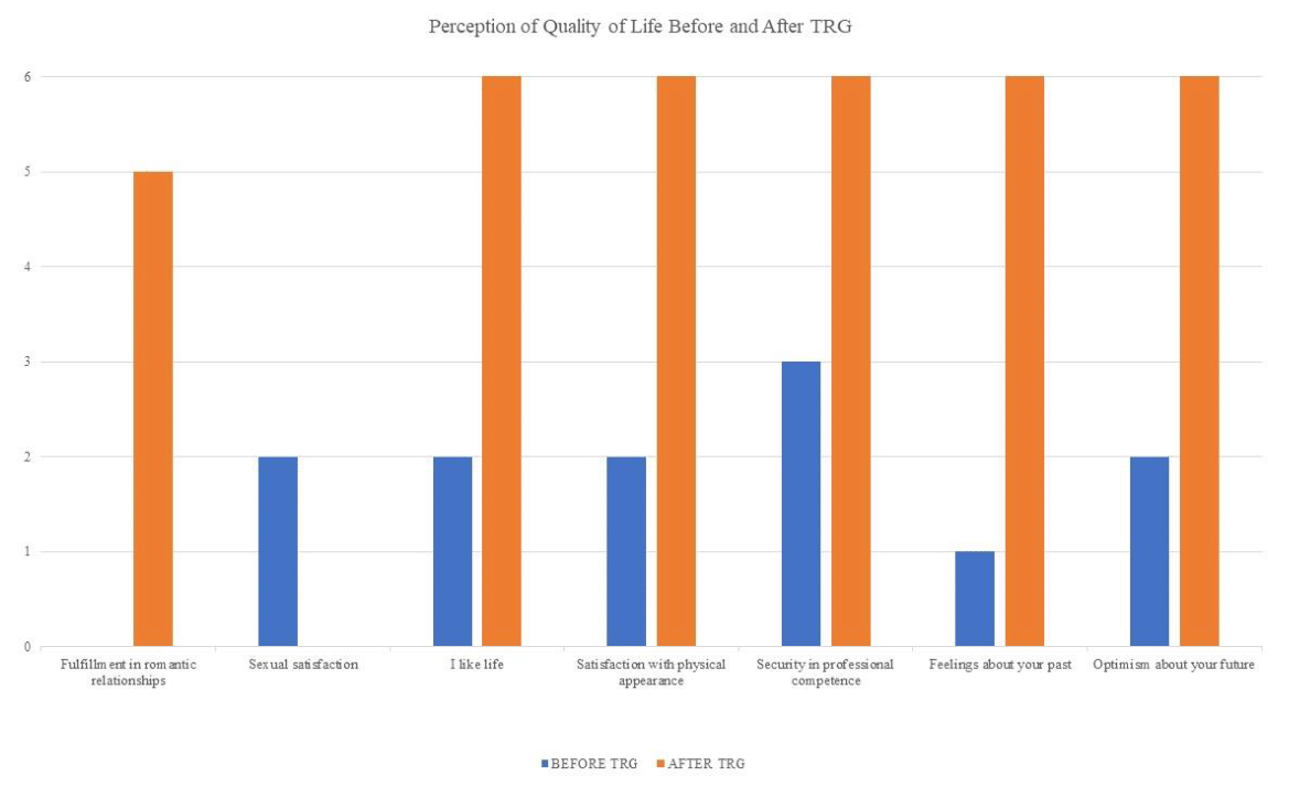 A 53-year-old woman was diagnosed with fibromyalgia and previously treated conventionally with Cognitive Behavioral Therapy (CBT) and pharmacotherapy, with no success in symptom remission and quality of life improvement. This patient agreed to participate in the study, signed an Informed Consent Form (ICF), underwent anamnesis, and responded to a qualitative questionnaire about her perceptions in various aspects of her life. The same questionnaire was administered after the completion of TRG treatment, allowing comparisons between the pre- and post-treatment states. The parameters addressed included satisfaction with romantic relationships, sexual satisfaction, enjoyment of life, satisfaction with physical appearance, confidence in professional competence, feelings about the past, and optimism about the future, each evaluated on a scale from 0 (poor) to 6 (excellent). She underwent the reprocessing protocols as described earlier.15 At the start of treatment, she was no longer receiving CBT but she was using medications for fibromyalgia, depression, and anxiety. At no time was she asked to discontinue medication treatment, which was discontinued at the end of TRG, at her own discretion, under medical supervision. The patient reported fear of rejection by her partner, a sense of familial alienation, and fibromyalgia crises at least once a month. In addition to fibromyalgia, depression, and anxiety, she reported suicidal ideation, sleep disturbances, and a suicide attempt without success. TRG sessions were conducted online on a weekly basis, totaling approximately 4 months of treatment. After completing treatment in 2021, she continues to be monitored semi-annually until mid-2026, using the same questionnaire administered at the end of TRG treatment. The participant underwent 12 treatment sessions with TRG. The protocols were carried out in the recommended order (chronological, somatic, thematic, future, and enhancement).12,13,15 Graph 1 depicts the participant’s results before and after TRG treatment regarding her perception of quality of life in various studied contexts.