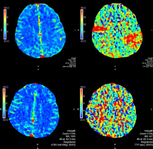 Figure 2 CT perfusion images. Top panel was done at onset of symptoms demonstrating elevated left frontoparietal elevated time to peak with relatively preserve cerebral blood flow. A smaller right MCA perfusion deficit can be seen as well. Following thrombectomy this perfusion deficit has now resolved, as seen in the bottom panel.