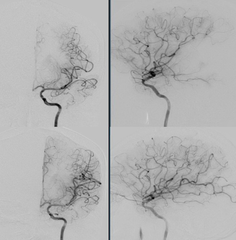 Figure 3 Cerebral angiogram in the AP and lateral views prior to mechanical thrombectomy with Solitaire stent-retriever system (top panel). Subsequent TICI 3 flow seen in the same territory following clot retrieval (bottom panel).