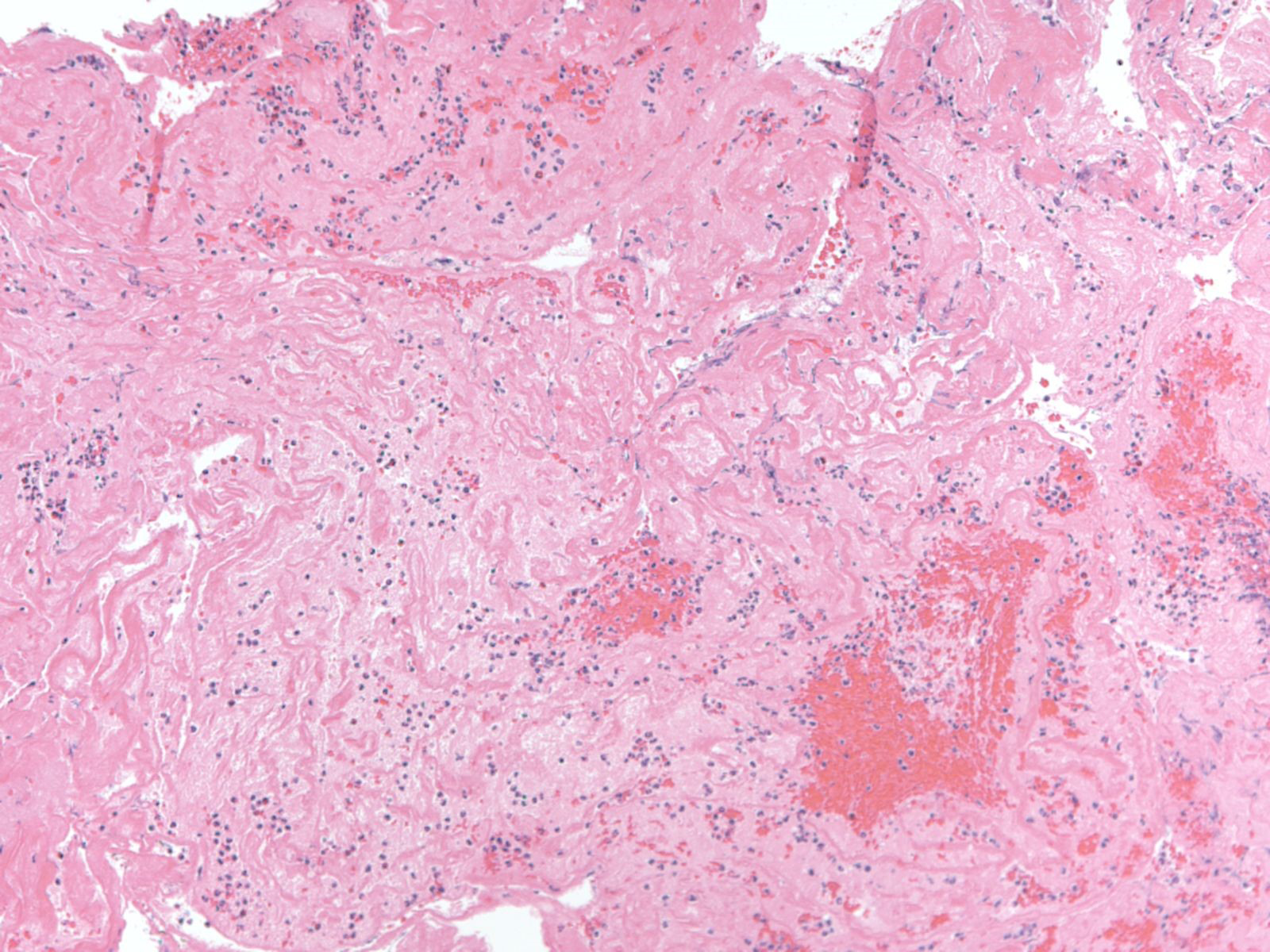 Figure 4 100x view of H&E section of aspirated thrombus. There are overlapping layers of fibrin admixed with platelets and rare pools of red blood cells admixed with neutrophils seen on this section.