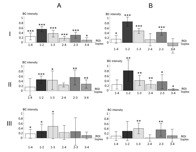 In Figure 2 shows histograms of the ВС intensity distribution in predetermined motor fMRI network of healthy people and patients with various degrees of right-sided hemiparesis after STBI in passive motor test (Figure 2A) and at rest (Figure 2B). Both the features of similarity and the differences in their spatial organization are noted. In both tests close order of the BC intensity values in the majority of ROI pairs of the same name was observed, as well as the tendency to weaken them from normal to rough hemiparesis.