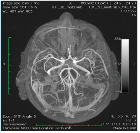Figure 1 Magnetic resonance imaging with angiography of the circulus of Willis and its afferent arteries. No arteriovenous malformations are detected.