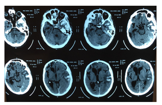 A 71-year-old man was assessed in 2016 at the emergency department due to alert deterioration caused by dehydration, his past medical history was remarkable. He had suffered from recurrent lobar hemorrhagic stroke since age 65. 2009 (right frontal), 2013 (left temporal) (Image 1), leading to an amyloid angiopathy diagnosis base on Boston Criteria; during 6 months in 2012 a low dose of oral prednisone was administered due to a suspicion of inflammatory amyloid angiopathy. After fluid administration the patient recovered to his baseline status: a major cognitive deterioration, left hemiparesis and severe mix aphasia was observed as sequelae, he was able to walk supervised. His relatives reported a gradual cognitive deterioration during the past year.