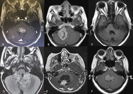 Figure 2 PF tumors. Diagnostic imaging registry courtesy Hospital Universitario del Caribe (Cartagena). (A) lung tumor metastasis in the fourth ventricle and right cerebellar hemisphere; (B) right APC meningioma; (C) left APC squamous cell tumor; (D) ependymoma; (E) right cerebellar hemisphere pilocytic astrocytoma; (F) medulloblastoma. APC, cerebellopontine angle.