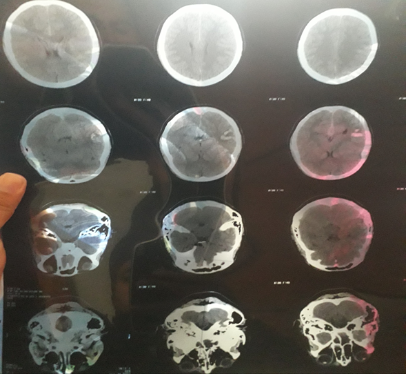 Simple cranial computed tomography (CT) documented images with intracerebral hemorrhage (Figure 1). Reason why it was decided to admit the patient to the neurology department of the hospital, as well as coordinated management with the neurosurgery department, non-surgical management was chosen at the time, the patient was kept on continuous monitoring, complete rest, intravenous solutions, pain management, as well as extravascular nutritional support. Due to clinical improvement and reduction in cerebral hemorrhage, he was discharged 2 weeks after admission to his home, and referred to the neurology.