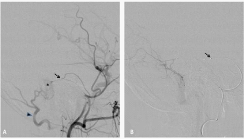 A. Digital subtraction angiography (DSA) of the of the left external carotid artery (ECA), lateral view, demonstrating a grade I IDAVF of the left lateral sinus supplied by the middle meningeal artery (black arrow) and occipital artery (black arrowhead). Note the early opacification of the lateral sinus (asterisk).