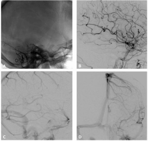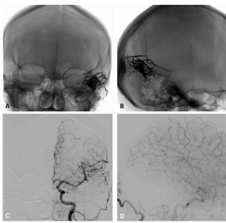Figure 4 A (anteroposterior) and B (lateral), radiography showing the cast of Onyx obliterating the parietal branches of the middle meningeal artery with arterioarterial reflux into homolateral feeders, the cast extending to the arteriovenous junction and the proximal venous outflow. C Anteroposterior and D lateral projections DSA of the common carotid artery demonstrating a complete obliteration of the fistula.
