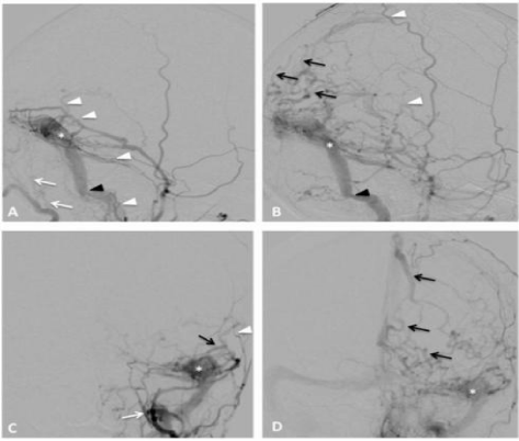 Figure 3 A 43-year-old woman developed a left pulsatile tinnitus. A and B (left ECA injection, lateral projection) C and D (left ECA injection, AP projection) DSA showing a Borden and Cognard grade II IDAVF with multiple shunts between the occipital artery (white arrow), parietal branches of the middle meningeal artery (white arrowheads) and left transverse sinus (asterisk). There is retrograde flow into cortical veins (black arrows). Note the associated sigmoid sinus stenosis (black arrowhead), Just upstream to jugular bulb.