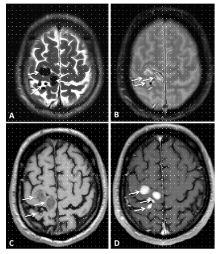 Figure 6 A 50year old man presenting with left partial rolandic seizures. A, T2, B, T2*, C, T1-weighted MR sequences before and D, after gadolinium injection, axial view, showing flow voids (white arrows) without haemorrhage in the right rolandic area.