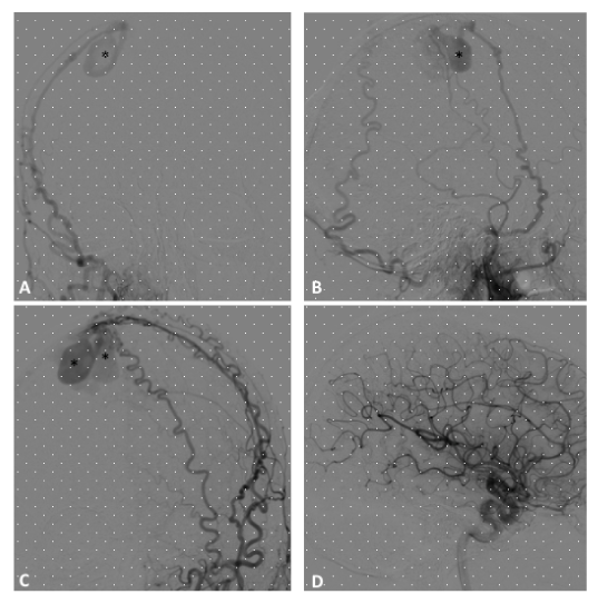 Figure 7 A, B, right and C left external carotid artery injections DSA confirms a Borden grade III IDAVF with venous ectasias (asterisk), which corresponds to Cognard grade IV, with bilateral arterial supply from the middle meningeal and superficial temporal arteries and direct CVD through dilated pial veins tributary of the superior sagittal sinus. D, Lateral projection DSA does not show ICA supply to the fistula.