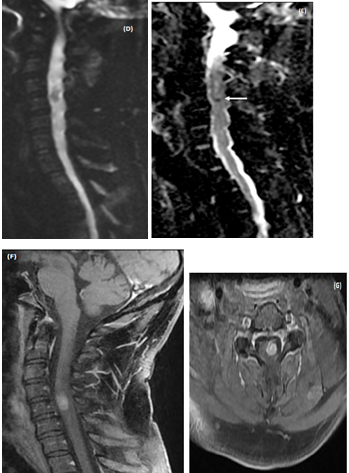 On blood testing at admission the complete blood count, comprehensive metabolic panel, inflammatory markers such as C-reactive protein level were normal. Brain MRI was normal. Spinal cord MRI showed cord enlargement at C4-C5 level and diffuseT2-images high signal from medulla to T4 level. A central area of necrosis hypointense was found on T1-images at C4-C5 level with peripheral enhancement after contrast (Figures 1A-1C). Together, these MRI findings were suggestive of an ISCA. Diffusion weighted images (DWI) showed hyposignal consistent with restricted diffusion on ADC map in the area of the necrotic portion of the cordlesion (Figures 1D&1E).