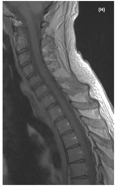 A 43-year-old malewith a medical history of HIV infection for 7 years and a breakdown of antiretroviral therapy (ART) for 4years, presented with 1month history of neck and dorsal pain and difficulty walking. Neurological examination was significant for decreased left hand strength (wrist extensor 4/5), and positive left Babinski.