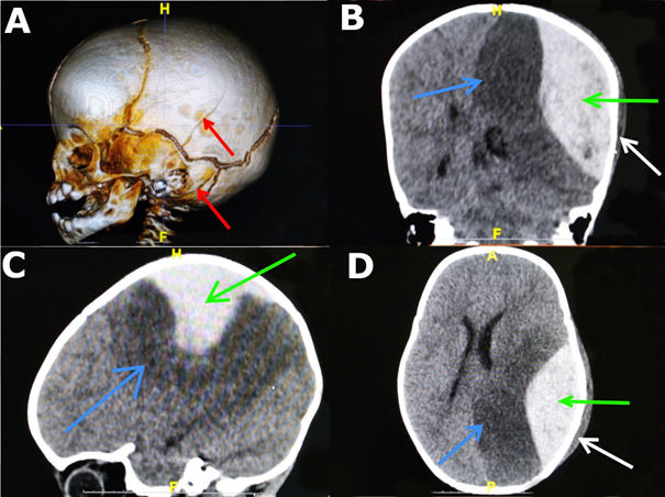 Figure 1 CT images of the patient showing: (A) 3D reconstruction of the temporoparietal fractures (red arrows); (B,C,D) parenchymal windows, the epidural hematoma (green arrow), the infarct in the territory of the left posterior cerebral artery (blue arrow) and the subgaleal hematoma (white arrow).