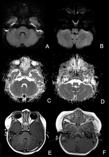 A 5-month-old female patient, hospitalized for three weeks due to seizures, difficulty swallowing and sucking. There was no history of trauma or previous surgery, and the metabolic screening was negative. She was born prematurely at 35 weeks and her APGAR score was 5/7. MRI showed signal abnormality involving both CTT, suggestive of necrosis.