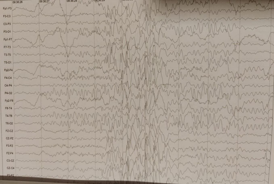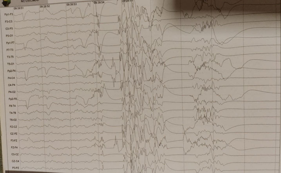 A new EEG was performed and showed epileptogenic activity with spike and wave complex and polyspike slow wave with diffuse projection in sleep and wakefulness, not accentuated by photostimulation, with recording episodes of seizures with upward ocular deviation and cervical extension of 2 to 3 seconds as follows: