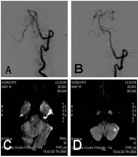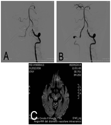 Acute basilar artery occlusion (BAO) is associated with a very poor outcome and has the highest mortality rate among intracranial large-vessel occlusions.1,2 The main causes of acute BAOs are a atherothrombotic occlusion, due to local thrombosis on a stenosis, and embolic occlusions, due to cardiac or arterio-arterial thromboembolism. Atherothrombotic occlusions account for 26-36% and embolic occlusions are founded in a 30-35% of cases of acute BAO.2,3 For a good functional outcome in BAO, recanalization is the most important prognostic factor.2-5 Recanalization rates are approximately with a intravenous and intra-arterial pharmacology thrombolysis respectively of 53% and of 65%, with rates of death or dependency of 78% and 76%.6 Recently, mechanical thrombectomy using self-expanding retrievable stent have initiated a new era in endovascular stroke therapy, allowing a fast and efficient flow restoration. Controlled trials and different personal series showed that stent retrievers can achieve a very high rate of recanalization of up to 90%, improving clinical outcome in patients with acute intracranial large-vessel occlusion.7-12 Despite these findings, in BAO clinical data and detailed analyses of mechanical thrombectomy with stent retrievers are still sparse.