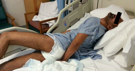 He was aphonic, communicating with his entourage with his right thumb and index finger only, but had apparent orientation to time, place and persons with coherent answers. Severe pain was present in the neck, left shoulder, wrists and sometimes in the ankles. He was unable to walk or stand for 10years, aphonic for 5years, fed through PEG tube since 3years and was totally dependent in all daily living activities.