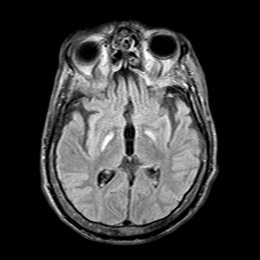 Figure 2 Pre-operative MRI showing selective necrosis of the Globus Pallidus interna, predominantly on the right side (above images are in radiological view).