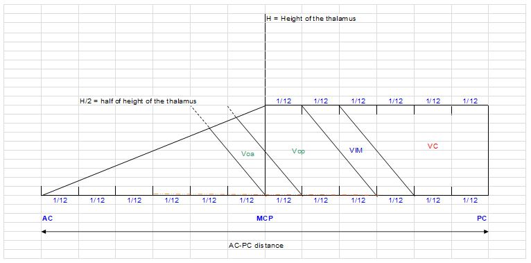 Coordinates for Voa were, according to Guiot scheme,27 0.5mm posterior to the mid-commissure point (MCP) in order to reach the posterior part of Voa and anterior part of Vop, 10mm lateral and at the level of the anterior commissure-posterior commissure (AC-PC) plane (Figure 3). Only indirect visualization was possible as conventional MRI sequences cannot delineate different thalamic nuclei.