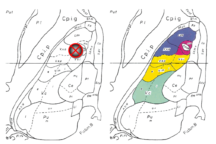 Right: Same plate as at left with superimposed color-coded subcortical afferent territories extrapolated from comparable horizontal level of the monkey 24 thalamus from the atlas by Ilinsky et al.30 Somatosensory territory is shown in green, cerebellar territory in yellow, pallidal territory in navy blue, and nigral territory in burgundy. All abbreviations are as in the atlas by Schaltenbrand and Wahren.