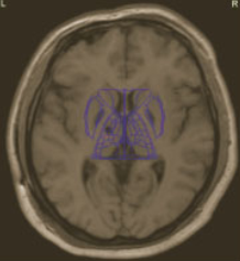 Stereotactic MRI was used to plan the target and trajectory (Siemens, 1.5 Tesla). All the sequences taken pre and post operatively confirmed to standard neuronavigation protocols- no gap, no interleaving, no angulations, square matrix and contiguous slices which were 1-2mm thick. 3D T1 sequences were acquired with an isotropic voxel (1mm) from the hard pallet to the vertex without contrast and with double dose contrast. 30 slices of 2mm thick T2 coronals were acquired; this sequence was centered at mid-commissural point (MCP). The length of AC-PC and width of third ventricle was measured at MCP. Height of the thalamus was measured on T2 coronals.