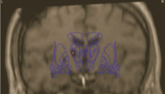 Figure 5 The correct position of the electrode was evaluated postoperatively by CT scan in stereotactic conditions and the Surgiplan software.