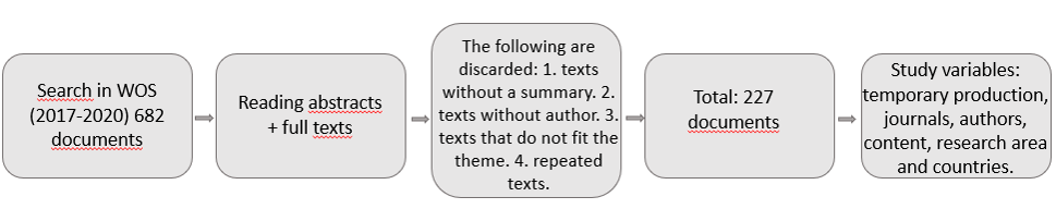 First, a literature search was conducted in the Web of Science database, with a time interval of 4 years, from 2017 to 2020. For this purpose, the search strategy ("perfectionism*" or "perfectionist") and ("primary education" or child* or teen* or adolescent* or "secondary education") was used. This strategy was used in the database obtaining a total of 682 documents. We then proceeded to read the abstracts of all the documents or, in cases where the abstract was not complete, to read the full text. In order to limit the search, we discarded those documents that did not contain an abstract, because the keywords and title did not provide sufficient information to understand the content, those that were not signed by any author, and those that did not fit the subject of the study, such as, for example, perfectionism based on adults. In addition, the papers that were repeatedly indexed in the database were counted only once. In this way, a total of 227 documents were collected and subsequently analyzed according to different study variables. The study variables used were: temporal production, by journals, by authors, by content, by research area and by countries (Figure 1).