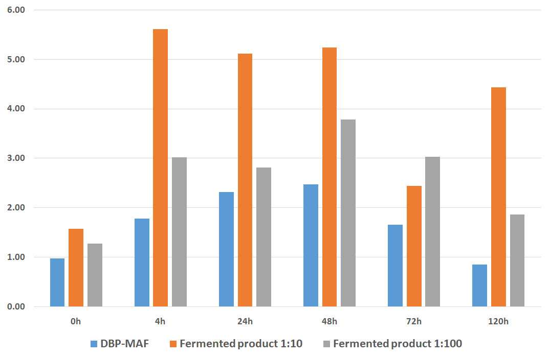 Study of in vitro interaction between the fermented product and human nagalase was performed by R.E.D. Laboratories (Zellik, Belgium) where human nagalase and DBP-MAF were purified. The experiments were performed using microtiter plates coated with a specific antibody able to capture human nagalase. Samples were incubated with a standardized dilution of a pool of 300 human sera from healthy subjects and, after 1 h incubation and exhaustive washing, complexes formed by nagalase and purified DBP-MAF, used as positive control, or nagalase and the fermented product, were detected with a horse radish peroxidase conjugate of a rabbit antibody. In order to establish the kinetics of interaction between nagalase and DBP-MAF or nagalase and the fermented product, the serum pool was mixed either with 200 ng of purified DBP-MAF, or with two dilutions (1:10 and 1:100) of the fermented product in phosphate buffered saline (PBS). The mixture was then incubated at room temperature for 4, 24, 48, 72 and 120 h. Values for nagalase binding activity in the absence of DBP-MAF or the fermented product, with only PBS in the reaction mixture, were taken as 1.00. The experiment was repeated twice and the results reported in Figure 1 are the means of the two experiments.