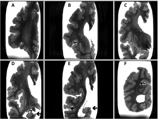 We present a post-mortem 7.0-Tesla magnetic resonance imaging (MRI) study of a 70-year old man with a history of epilepsy, due to PMG and suspected hippocampal sclerosis. Six coronal sections of a cerebral hemisphere and a horizontal section of a cerebellar hemisphere were examined with T2 and T2* sequences. PMG was mainly observed in the parietal cortex. The hippocampus had a normal aspect. Moderate white matter changes (WMC) were present mainly in the parietal region. No cortical micro-infarcts were observed (Figure 1). On the T2* sequence only a few cortical micro-bleeds (CoMBs) were present. The cerebellar cortex had a normal appearance.