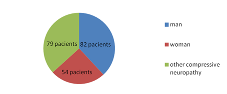 Altogether, 215 subjects with compression neuropathy were submitted to 412 surgeries between February 2009 and March 2013 in the Hospital Colonna Dom Rodrigo de Menezes of the Public Health System in Salvador-Bahia. The mean age was 41,06 (8 and 87 years (mean,sd 14,57). Ulnar nerve was the most frequently involved, followed by the posterior tibial median and fibular nerve. We enrolled a total of 136 patients, of whom 82 patients were males and 54 were females, as can be seen in Figure 1.
