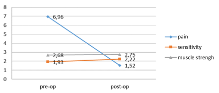 Figure 2 presents the mean change in pain; measured sensitivity and muscle strength for group I after surgery, while Figure 3 presents the mean change for group II after surgery.