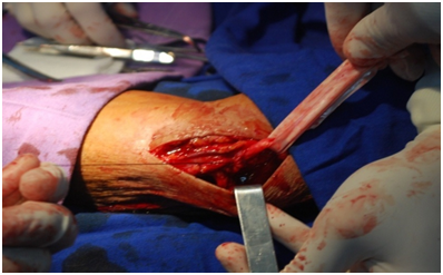 Patients submitted to both simple decompression and subcutaneous transposition were put under local anesthesia with lydocaine 2% and epinephrine without tourniquet and the arm abducted. A curvilinear incision 7 cm longer is made anterior to the medial epicondyle of the umerus. The subcutaneous vessels are coagulated with bipolar. The dissection of the subcutaneous tissue inside the superficial plan leaves a fasciodermal sling over the fascia of flexor-pronator muscles utilized to cover the ulnar nerve in case of transposition. After retraction of the two lips of the incision, the ulnar nerve is dissected between the medial epicondyle of umerus and olecranus. After section of the ligament between the two bones, the ulnar nerve is totally freed from its natural bed. It is very important to dissect as proximally as possible intending to section the arcade of Struthers and the medial septum points of compression of the ulnar nerve. The distal dissection is carried until the two divisions of the flexor carpi ulnar muscle are reached. The articular branches of the ulnar nerve are sectioned in order to take off the nerve from his natural bed. The motor branch to flexor carpi ulnar muscle is preserved and the channel that subsides after the nerve mobilization is closed with 3-0 nylon. The subcutaneous is closed in one layer in case of single decompression with vycril 2-0 or in two layers in case of transposition involving fasciodermal sling of subcutaneous tissue previously dissected. The skin is closed with simple running suture with mononylon 3-0. A bandage is applied without compression. The skin suture is removed with 3 weeks. No immobilization is required and the surgery takes over 20 minutes with the patients discharged home. Image 1 show a hypertrophied ulnar nerve and Image 2 shows the simple decompression of the ulnar nerve in a patient diagnosed with leprea.