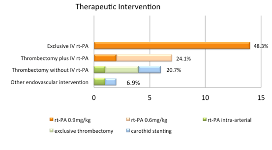 Therapeutic options were one of the following: intravenous (IV) rt–PA (0.9mg/kg or 0.6mg/Kg), intra–arterial rt–PA, arterial thrombectomy or acute carotid artery stenting if needed.
