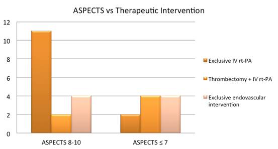 All patients underwent routine brain–CT imaging and early ischemic changes (EIC) were assessed. As a blinded investigator, a Neuroradiologist with 6 years of experience analysed EIC using Alberta Stroke Program Early CT Score (ASPECTS) of every exam and that score was correlated with the type of treatment selected and with the clinical outcome. Contrast brain–CT imaging was routinely performed. Magnetic Resonance Imaging (MRI) was not routinely performed. When decided by the medical team, MRI was done and mismatch diffusion–FLAIR was evaluated in order to decide most adequate therapeutic approach.