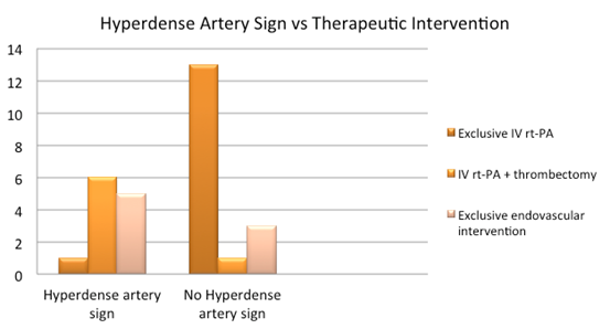 With respect to the hyperdense artery sign, 91.7% (n=11) of patients were submitted to an endovascular intervention, whereas 76.4% (n=13) of patients without hyperdense artery sign were treated with intravenous rt–PA (Figure 3).