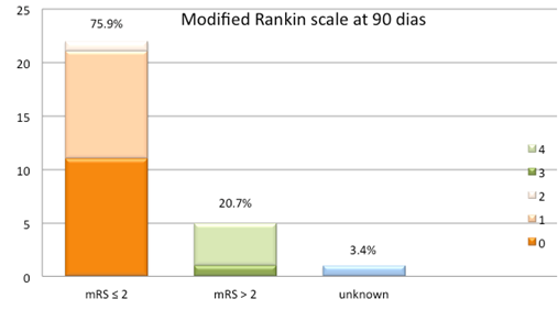 In our study 75.9% had a good functional outcome at 90 days, measured by a mRS ≥ 2.