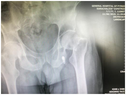 Figure 4 Female’s PD patient post-operative X-ray, after 5 months from the surgical treatment with internal fixation of the cervical fracture of her left hip.