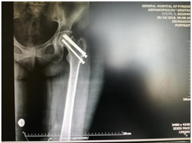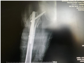 Figure 6 Male’s PD patient post-operative X-ray, after 40days from the surgical treatment with intramedullary nailing of the sub-trochanteric fracture of her right hip. This patient had fallen down the steps of the Church.