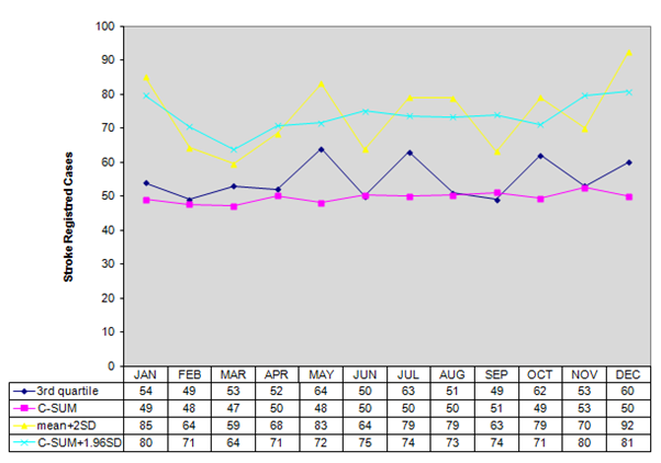 Reliability of the models: There is no threshold epidemic methods developed for NCDs, and therefore the authors used models tested for infectious disease. Although this can be seen as a limitation, the available models for infectious disease can be temporarily used for surveillance purpose in the absence of more reliable and specific model for stroke and NCDs threshold detection.