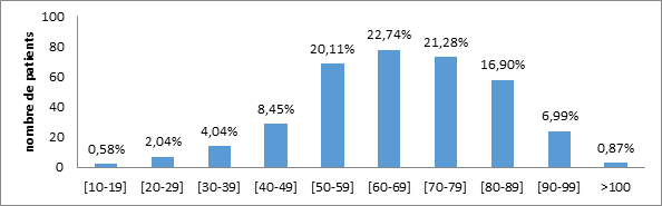 The mean age of patients was 64.2 years with extremes of 17 and 104 years.