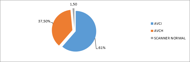 Only 201 patients have benefited from CT-scan or 58.60%. We have noticed 61% of ischemic stroke and 37.50% of hemorrhagic stroke, and three patients presenting a transient ischemic attack had a normal brain CT-scan or 1.50% of the cases (Figure 1&2). Fifty-nine patients had performed an ECG or 17% and the cardiac arrhythmias by atrial fibrillation represented 30% of the ECG and in 10% of the cases, the ECG was strictly normal (Table 3).