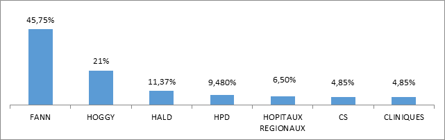 In our series, 211 patients or 61.51% of the patients have been evacuated in health facilities. Fann Hospital was the main host structure with 45.49% of our patients received (Figure 3). All the patients transported by the EMS or 208 (60.93%) had been installed in a semi-seated position at a 30° angle. Among the patients transported, only 10 patients or 4.80% had benefited from an orotracheal intubation due to neurological complications (Glasgow of 8 or less). For the monitoring of vital functions, a scope had been installed for all our transported patients. The patients transported by the EMS had benefited from an oxygen-therapy on neurological (10.57%), breath (2.40%) and hemodynamic (1.92%) basis. Those presenting clinical complications (14.89%) had benefited from urinary catheter. In our series 13% of the patients presented hypertensive crisis but the blood pressure was strictly respected during transportation. All the transported patients or 60.93% had benefited from an intravenous access with an isotonic saline serum. The number of patients presenting an ischemic stroke was of 61% but none had thrombolysis.