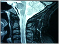 Our second case is a 30-year-old woman who had a history of tetraparesis in 2010. She improved with minimal residual neurological deficit. In August 2011 she presented with Left Hemiparesis and was investigated for young stroke. In November 2011, she presented with Right Optic Neuritis. Clinical examination revealed evidence of Right Optic Neuritis, tone was increased all 4 limbs, power was 4 to 4+ both upper and lower limbs, reflexes was brisk and Babinski sign was positive over the left. There was also evidence of peripheral asymmetrical sensorimotor neuropathy. All connective tissue screen and Anti-Aquaporin 4 antibody was negative. There were no other evidence of auto-immune disease. MRI showed high signal intensity in right corona radiata, right thalamus, genu of corpus callosum, subcortical white matter, both insula, midbrain and medulla oblongata. Figure 2 cervical spines revealed ill-defined signal intensity at C6 level with no contrast enhancement. Enhancement was seen in both Optic nerves in MRI of the orbits. Oligoclonal band was not sent from the previous hospital where she was managed. She was scheduled for a repeat MRI. Our working diagnosis was Multiple sclerosis with a differential diagnosis of Neuromyelitis Opitica Spectrum of Disorder. We could not associate her peripheral neuropathy to any other disorder. She developed sudden onset of shortness of breath and was admitted to a hospital closer to her residence. The patient developed cardiorespiratory arrest and died after a failed resuscitation. A definite cause of death was not known and a post-mortem was not conducted.